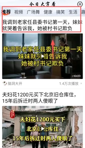 回到主界面后,挑选自己感兴趣的内容板块,像健康、广场舞这类都可以,接着通过上下滑动的方式来浏览短视频和文章,只要点击打开,内容就会自动切换到全屏播放模式。