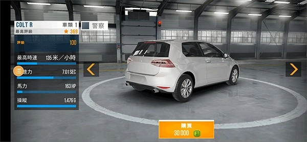 7、另外游戏中还有多种不同款式的车辆可以选择,且每辆车的评级、时速、马力,和操控难度都不同,玩家可以根据自己的喜好选择