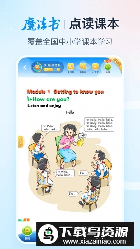 课本点读功能:可在线点读全国主流版本的小学英语与语文教材,拥有连读、跟读、翻译以及离线使用等功能,能让手机成为智能点读工具。