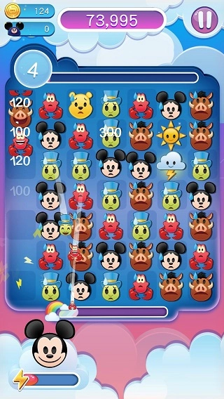 游戏开始后,和其他同类游戏的操作类似,只需滑动使三个相同的表情连成一线就能消除得分。而当凑齐四个相同表情时,会生成带有闪电的云朵,它能一次性消除一整行。