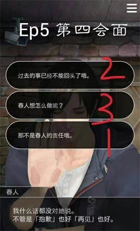 游戏从第五章开启,你可以依据图片里的选项来对应不同结局(像选项后面标注红色数字3的,选这个选项就会走向结局三)。这三次关键对话特别关键,要是想体验结局三,就得在这三次对话里都选数字是3的选项。只要依照对应的数字去选择,就能逐个解锁所有结局的可能。