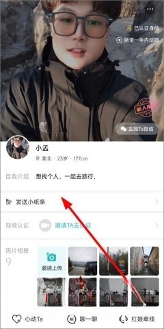 进入异性的资料主页后,可查看对方的照片、身份认证信息、心情动态以及详细资料,若要发送小纸条,点击用户头像下方的相关按钮即可。