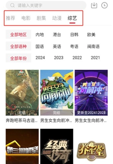 1、进入首页后,顶部的菜单栏呈现出各类影视剧集,像电视剧、综艺、动漫之类的都包含在内。