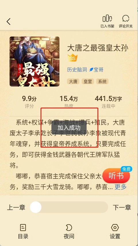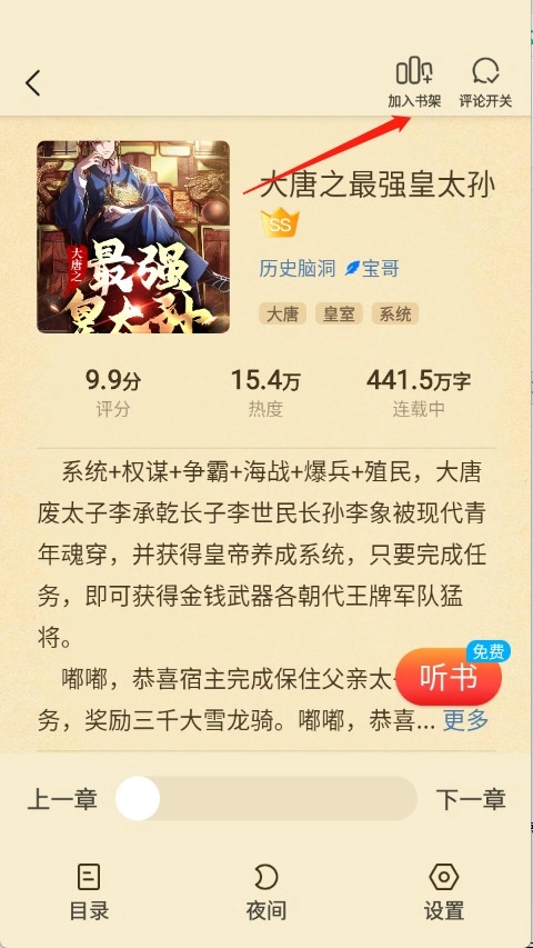 2.点击进入小说阅读页面,点击右上角的“加入书架”