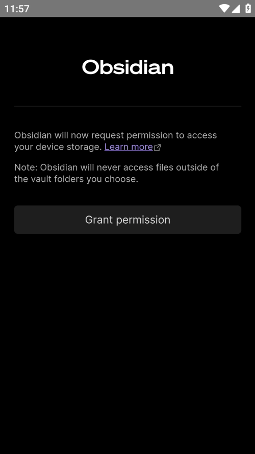 首先在本站下载并安装软件后,打开Obsidian黑曜石笔记,初次使用时需要允许软件获取一些必要权限,请点击下图所示的【Grant permission】位置。