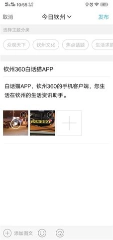 2.通过发帖按钮,您可以选择上传已有的照片、视频,或是直接拍摄新的内容。白话猫支持15秒视频的即拍即传,也允许同时上传10张以上的照片,平台的30万用户(包括钦州360用户)都能看到您发布的内容。温馨提示:首次使用白话猫时需要完成实名认证,这是遵循相关法律法规的要求,与微信实名登录发言的机制相同,每个手机号仅能绑定一个白话猫(钦州360)账号。