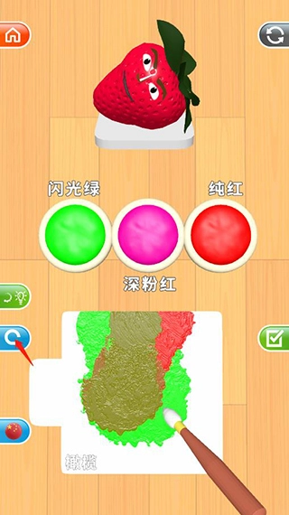 纯红→深粉红→再点一次纯红,就能合成100%的深红色草莓啦