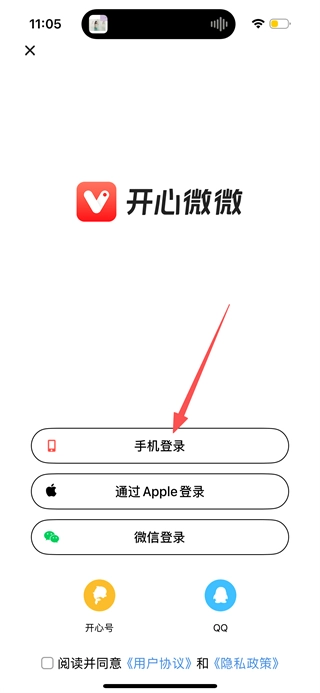 在开心微微的首页,点击底部的“我的”选项,即可进入登录选择页面。