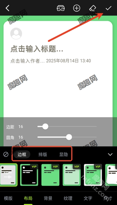 在编辑界面中输入文字内容,对边框样式、排版布局等进行调整,全部设置完成后点击保存按钮就可以了。