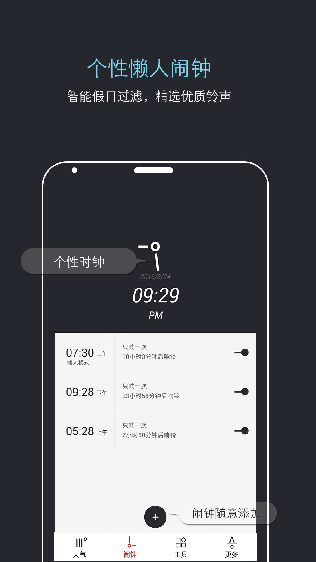 操作便捷,提醒准时。独特的懒人模式,智能过滤节假日,堪称起床困难户的福音
