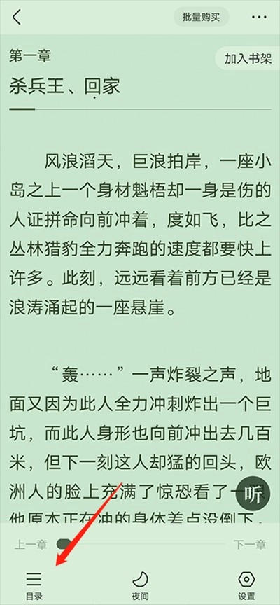 2、点击进入小说阅读,点击左下角目录,如图所示
