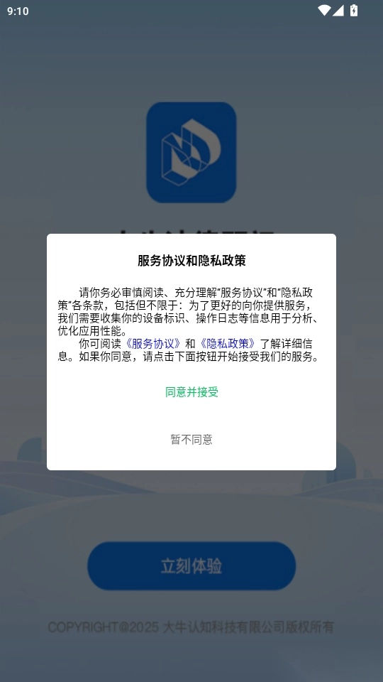 打开软件后阅读“服务协议和隐私政策”,点击“同意并接受”按钮即可进入。