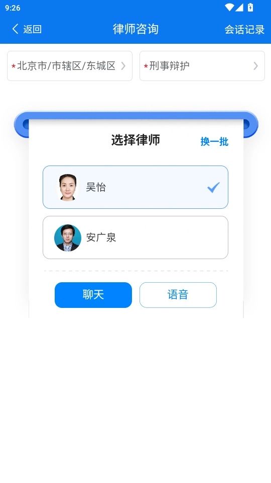 选择地区和纠纷类型后,就能筛选出附近的优秀律师;选中律师后点击“聊天”,即可向其咨询问题。