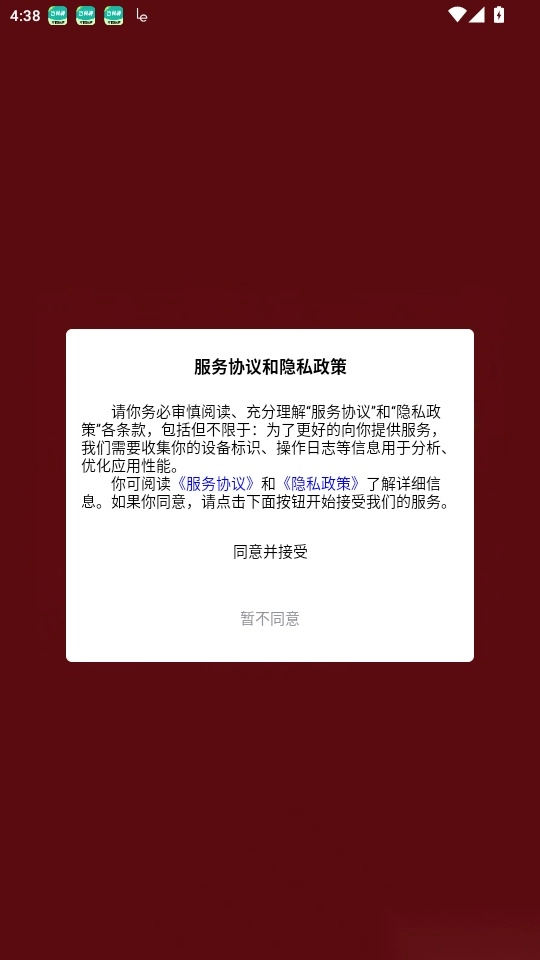 打开软件后,阅读“服务协议和隐私政策”,然后点击“同意并接受”按钮进入。