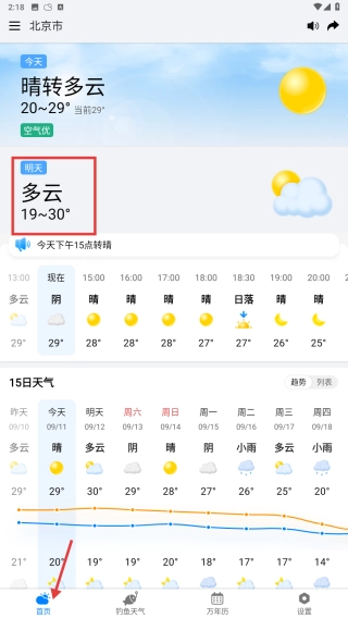 打开天气应用,进入其首页后,查看北京市当前的实时天气情况,像晴转多云、气温在20到29摄氏度之间这类信息都要了解,同时也需查看未来时段的天气状况以及15天的天气变化趋势。
