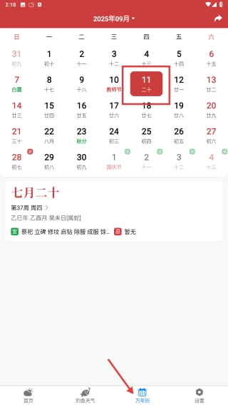切换至万年历界面,查看年9月的日期,以及与之对应的黄历详情,比如七月二十当天适宜办理的事项等。