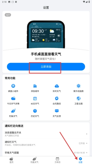 点击底部的设置选项进入设置页面后,你可以通过点击“立即添加”按钮把天气组件添加到手机桌面,这里还包含40日天气等常用功能,同时也能对通知栏定向推送等设置进行管理。