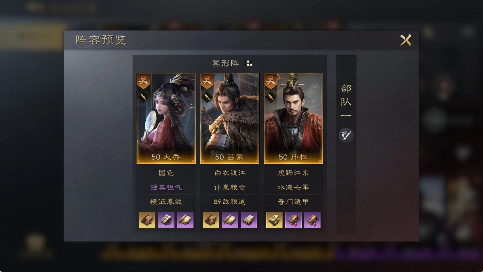 大乔、吕蒙、孙权这套阵容的核心思路在于,通过给敌军叠加各类异常状态来实现控制效果,同时配合打出高额的爆发伤害。其中“断粮”“技穷”这类控制状态,对于部分依赖主动战法或指挥战法的队伍能起到不错的克制作用,但要是碰上速攻爆发型的队伍,就容易落入下风。
