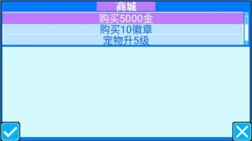 点击商城图标后,能挑选购买金币、徽章、宠物升级道具等各类物品。