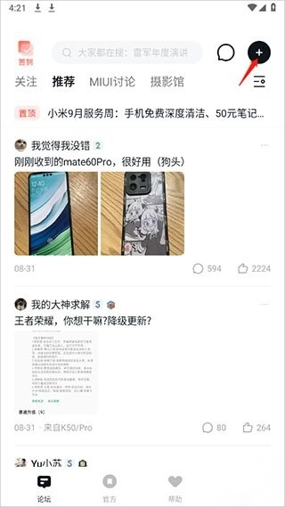 打开最新版的小米社区,进入首页后,点击右上角的加号图标。