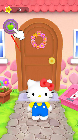 3、凯蒂猫出来之后,点击苹果可以给它喂食;
