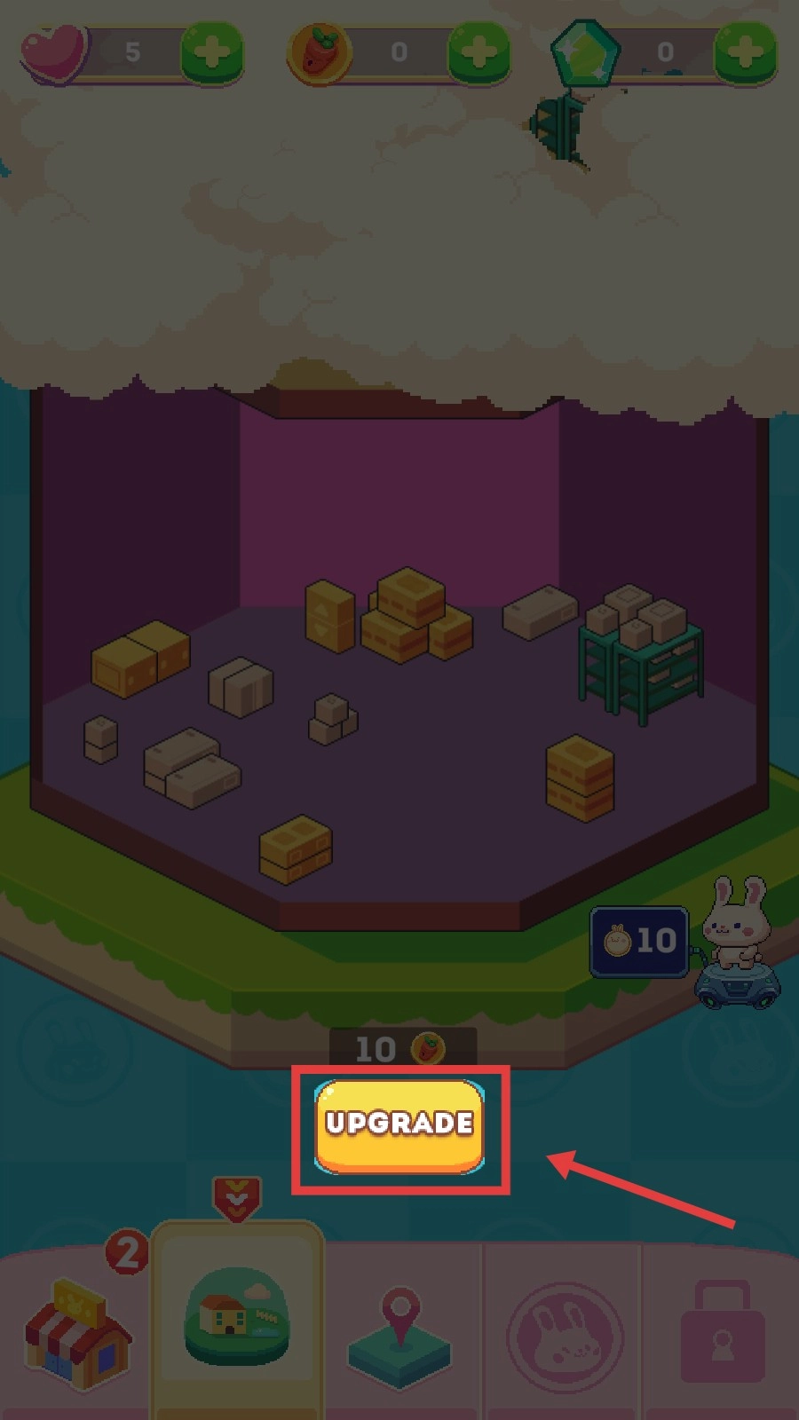 2、进入新场景后,消耗10个【胡萝卜】并点击【UPGRADE】按钮来升级区域,让我们的岛屿变得更棒吧