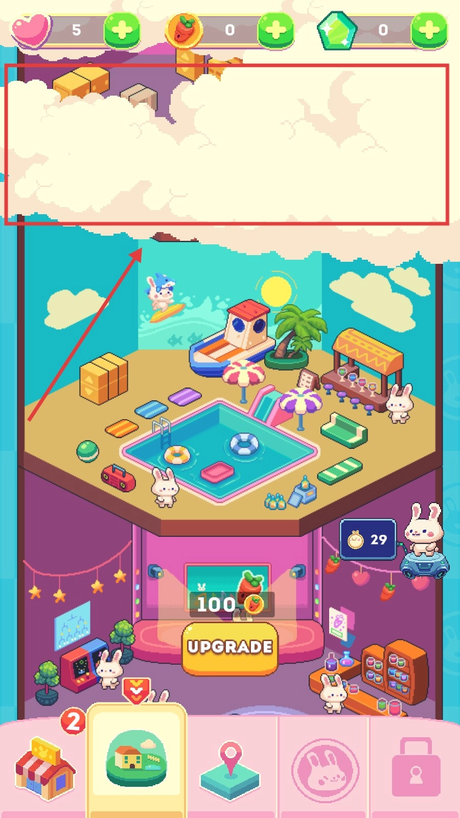 3、持续积累资源,点击升级按钮,解锁上方的云雾区域,建造更多有趣的设施,让小兔子们能快乐地生活。
