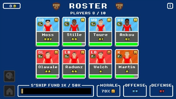 整体游戏采用像素复古风格,为你带来更多乐趣与惊喜体验。你可以见证亲手培养的球员逐步成长,在这片天地尽情书写属于自己的球员传奇;而通过心理辅导与团队活动,便能有效提升专注力。