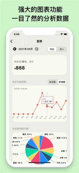 10.统计视图:提供了折线图和柱状图等统计视图,帮助用户直观地了解收支情况。