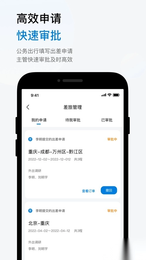 【差旅管理】可随时提交出差申请,流程便捷;审批者能即时收到通知并处理,响应高效。