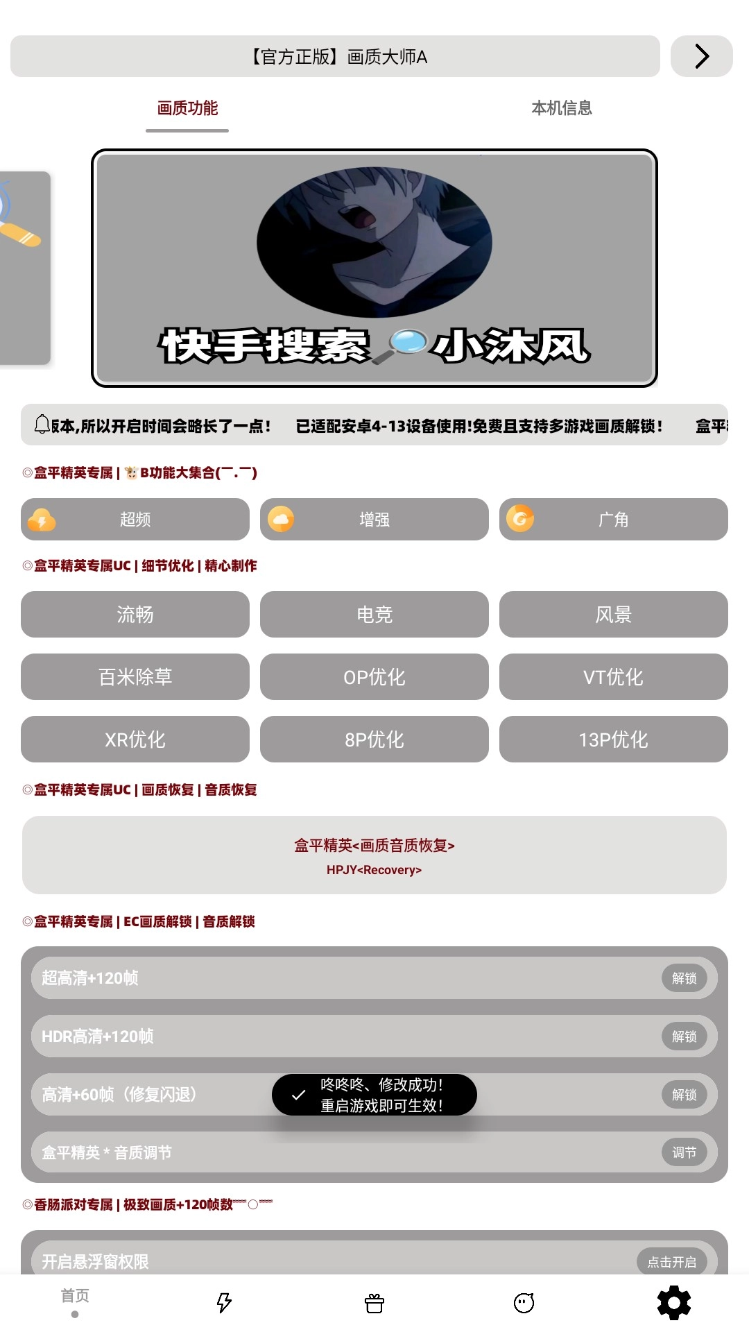 小沐风画质大师120帧是一款融合高清渲染、流畅帧率与智能优化功能的游戏辅助工具。它专为追求极致画质体验与卓越性能表现的玩家量身打造,用户仅需通过一键操作,就能解锁超高帧率模式,同时优化画面细节,让游戏中的角色与场景呈现出更清晰、更逼真的视觉效果,是喜爱吃鸡、MOBA类游戏玩家的必备辅助利器。