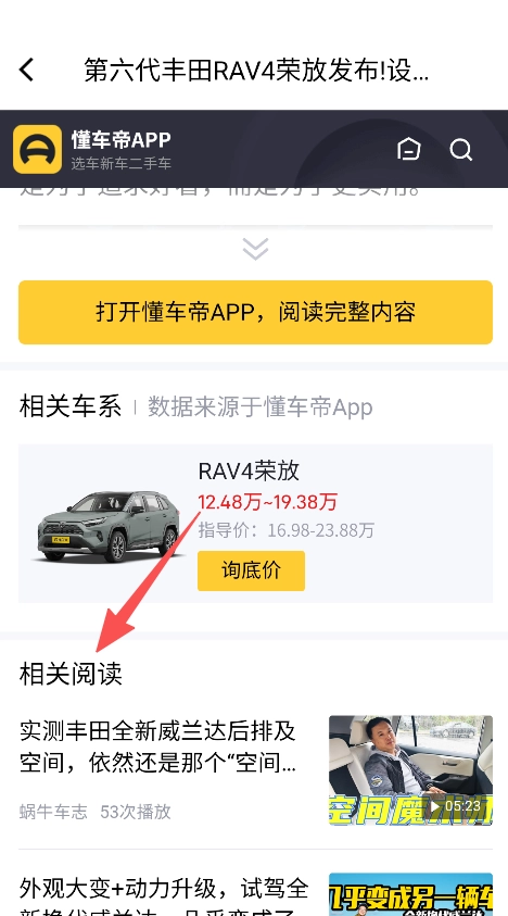 点击资讯进入详情页面,可查看相关车型的价格信息以及相关阅读内容。