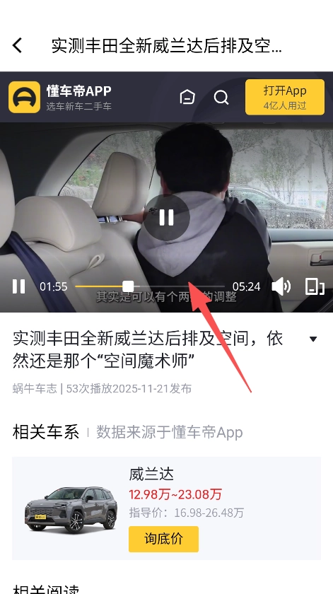 点击相关阅读板块里的视频,观看汽车实际测试内容,就能了解车辆空间等方面的信息。