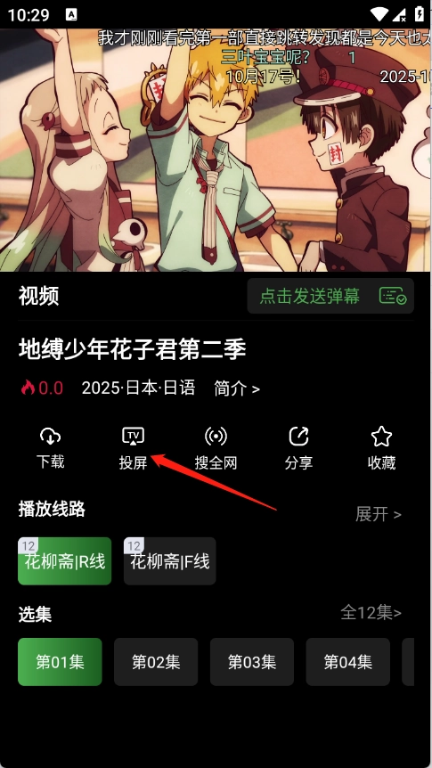 1、打开动漫进入播放界面,点击投屏按钮。