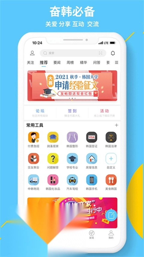 奋斗在韩国是专为对韩国学习、生活、旅行等方面有需求的用户打造的平台,它提供在线信息交流的空间,各类内容都能在此搜索了解,更新速度快,用户还能在这里交流沟通,甚至找到志同道合的朋友,丰富的服务类型汇聚于此,让用户对韩国生活更加向往。