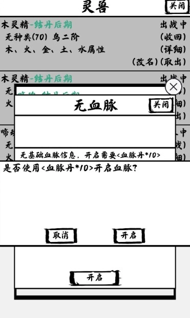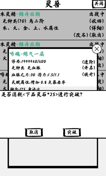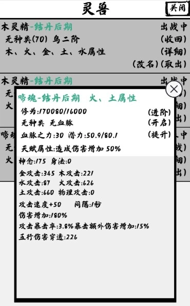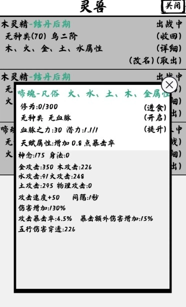 灵兽点击进食喂材料后 开启进阶 能到自身境界后期
