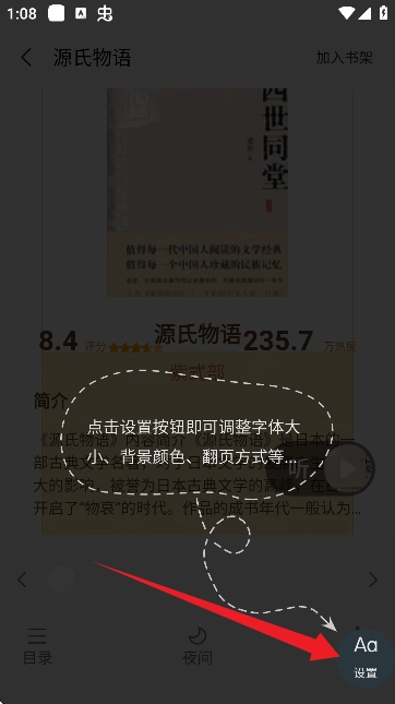 5、然后点击设置按钮即可调整字体大小、背景颜色、翻页方式等