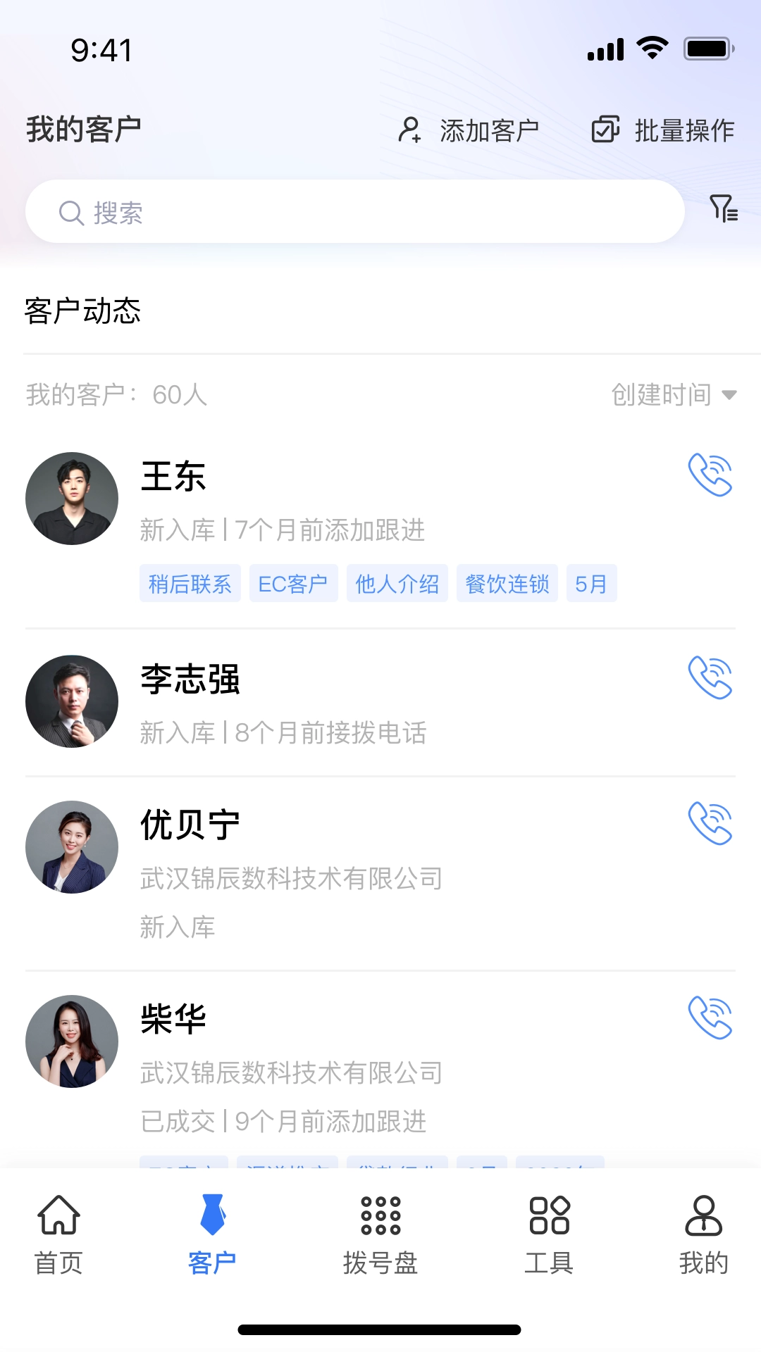 在联系人界面中,可快速查找联系人拨打电话