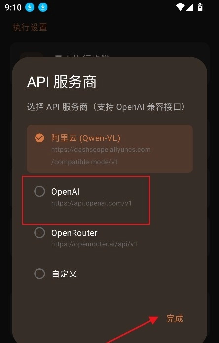 1.启动肉包App后,先进入设置页面,找到并点击“api服务商”选项,勾选对应的服务商,最后点击“完成”按钮即可。