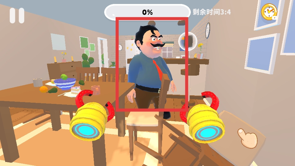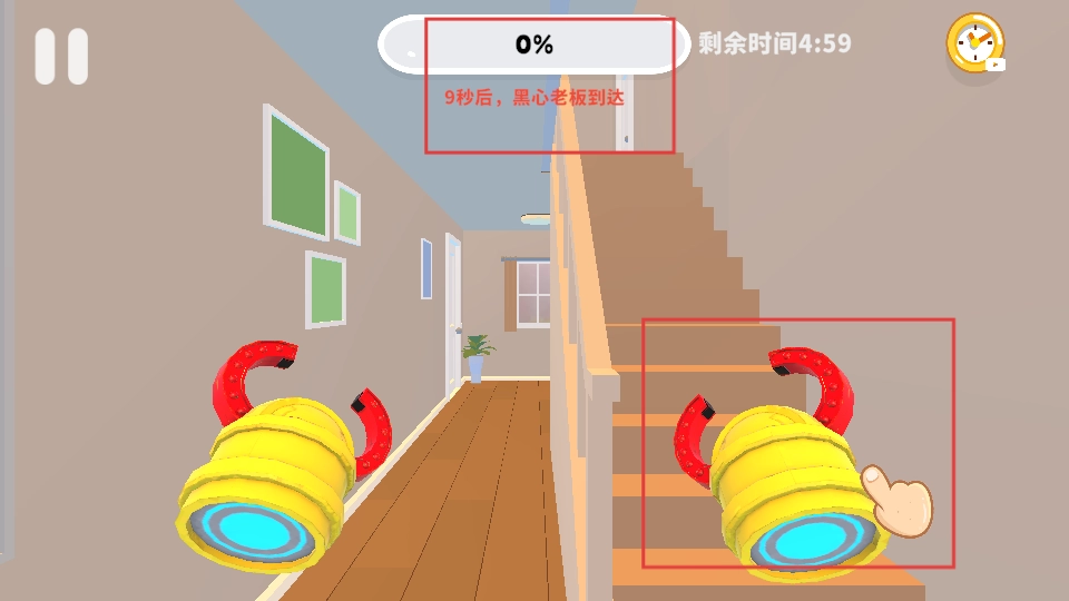 2、游戏开始后,会有剩余时间和进度显示,还会提示黑心老板到达的倒计时,操控带有红色部件的黄颜色装置,在场景中进行操作。