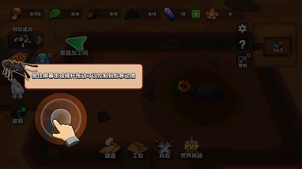 1、刚苏醒的蚁后非常饿,快为它建造个蘑菇加工间吧!