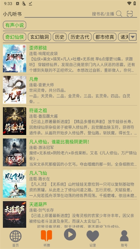 在听推界面中,能够找到大量热门的有声小说作品,涵盖奇幻仙侠、玄幻脑洞、历史古代、都市修真等多种类型。