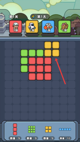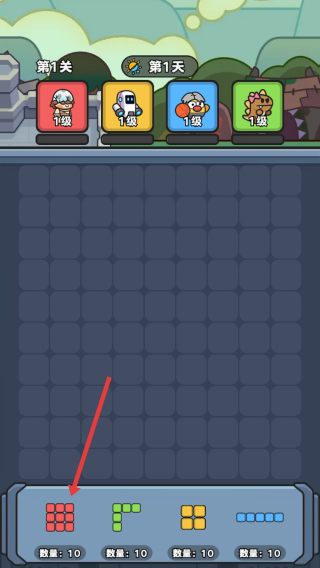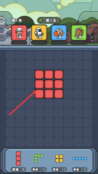 1、选择并放置:拖动底部的红色竖条方块,填充棋盘中央的红色区域。