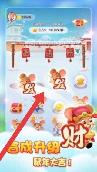 1、在主界面上,点击箭头所指的“发”字金鼠,进行合成升级,加快收益速度,积累金币,迎接以鼠年为主题的玩法。