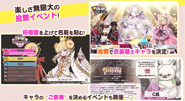 除了精彩纷呈的战斗活动外,我们还会不定期开展人气投票以及比拼角色好感度的“oreyome gp”等趣味十足的活动。