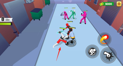 1、在街道场景,操控角色近战攻击,利用技能(右侧图标),对抗多色服装敌人,积累连击。
