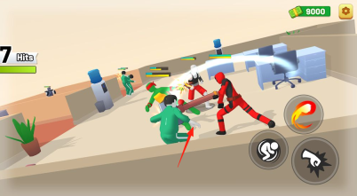 3、在会议室场景,应对绿衣持棍敌人,灵活走位,闪避攻击后反击,降低敌人血量获胜。