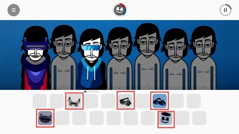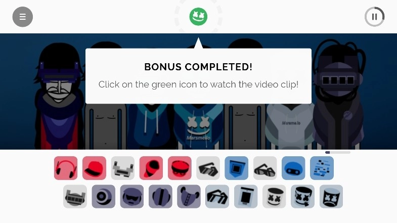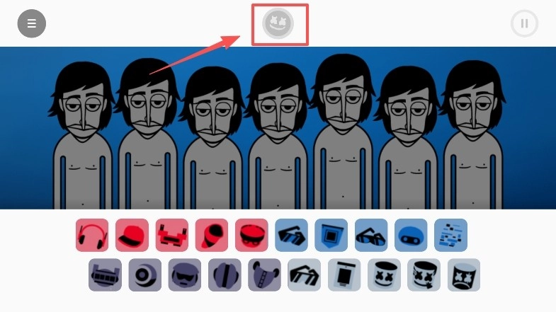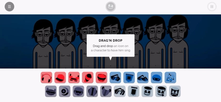 3、经典的节奏盒子玩法是这样的:把下方的面具拖到上方的人物身上,人物就会呈现出不一样的形态,发出不同的声音。