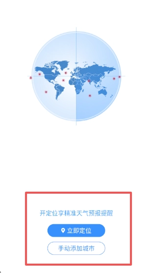 我们需要执行城市定位操作,进入相关界面后,您既可以手动添加城市,也可以选择立即定位。