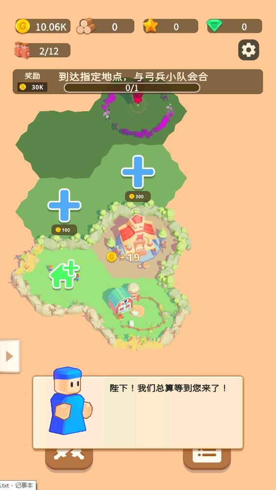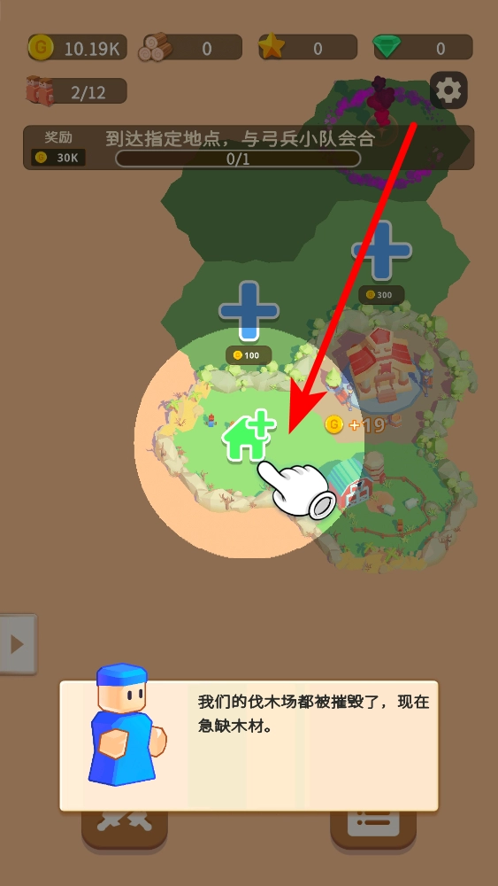 当前界面显示木材资源数量为0,你需要点击那个绿色的加号建筑按钮,这样就能进入建造界面去获取木材。等你完成这一系列操作后,不仅可以推动和弓兵小队会合的任务进度,还能得到30K金币的奖励。